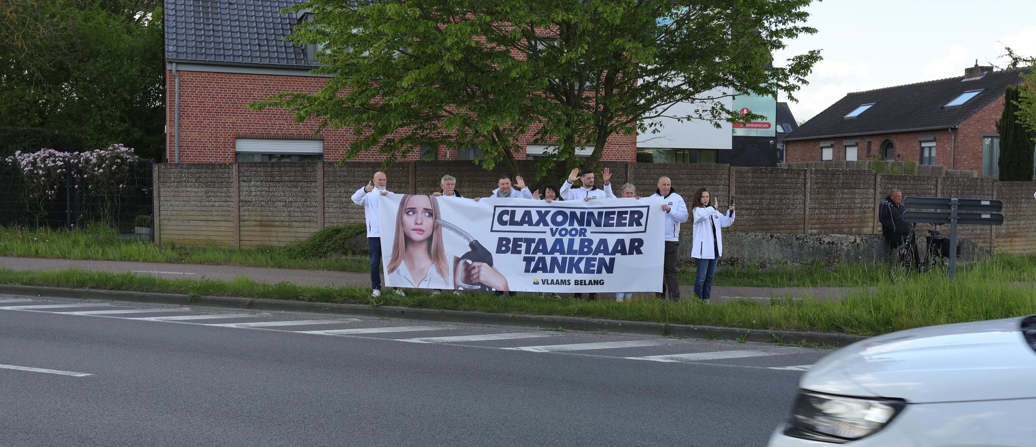 Wie vanmorgen over het kruispunt van de N16 met de Hingenesteenweg reed, kon er niet naast kijken (of horen). De lokale afdeling van Vlaams Belang Klein-Brabant hield er een opvallende actie tegen de hoge brandstofprijzen. Met de oproep “Claxonneer voor betaalbaar tanken” lokten ze heel wat reactie uit bij het passerende verkeer.